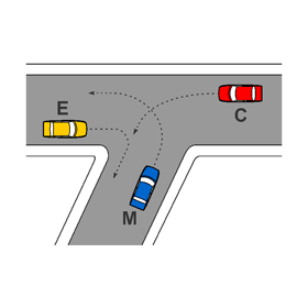 Dovendo attraversare l’incrocio rappresentato in figura il veicolo E transita per primo