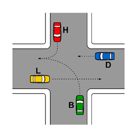 Giungendo all’incrocio rappresentato in figura i veicoli passano nel seguente ordine: H, D, B, L