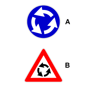 Il segnale di figura (A) su strade extraurbane è preceduto dal segnale di pericolo di CIRCOLAZIONE ROTATORIA in figura (B)