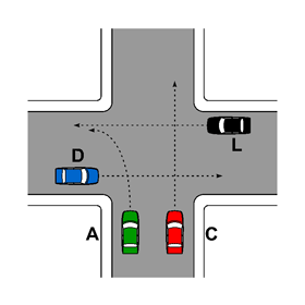 Nell’attraversare l’incrocio in figura i veicoli D e L passano contemporaneamente prima del veicolo A