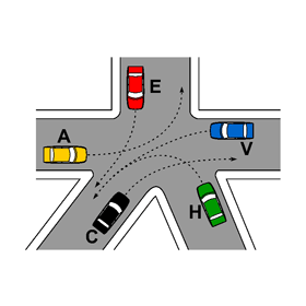 Nell’incrocio rappresentato in figura il veicolo V deve attendere che siano transitati i veicoli A, E, H