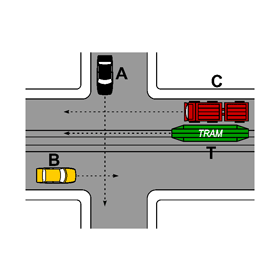 Nell’incrocio rappresentato nella figura i veicoli T e B possono transitare contemporaneamente