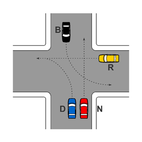 Nell’incrocio rappresentato nella figura il conducente del veicolo B dopo essersi portato al centro dell’incrocio, deve attendere il transito del veicolo N