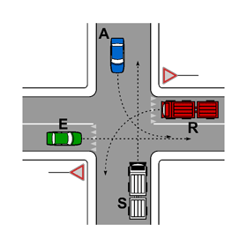 Secondo le norme di precedenza nell’incrocio rappresentato in figura il veicolo S transita prima di tutti gli altri veicoli